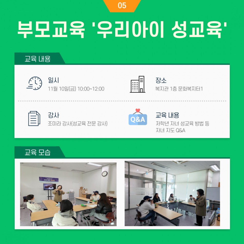 또한 보호자들을 대상으로 저학년 아이들에게 성교육 방법에 대해 부모교육이 진행되었습니다.