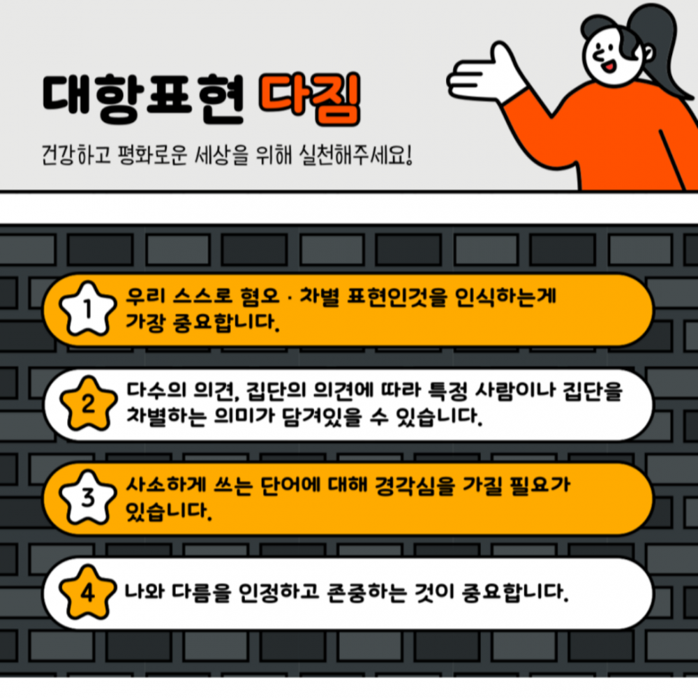 혐오표현 사전적 의미 시리즈를 통해 객관적인 사실을 강조하고, 다양한 사람들에게 알려 혐오와 차별에 대항해봅시다.
