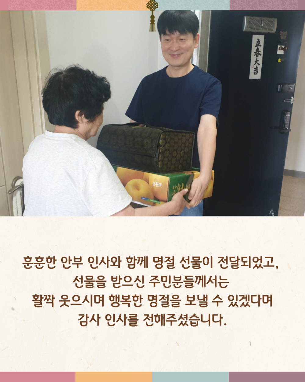 선물을 받으신 주민들께서는 덕분에 행복한 명절을 보낼 수 있게 되었다며 활짝 웃으셨습니다.