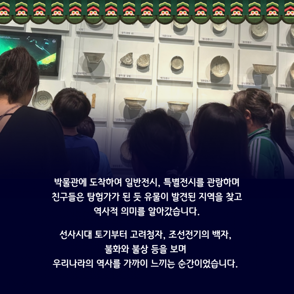박물관에서는 선사시대부터 조선, 근 현대에 이르기까지 유물과 작품들을 보며 우리나라의 역사를 가까이에서 직접 느껴보는 시간을 가졌습니다.