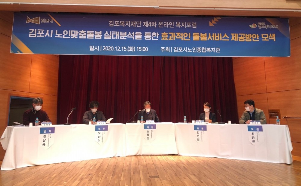 김포복지재단과 김포시노인종합복지관이 협력연구를 진행하고 그 결과를 공유하고자 ‘김포복지재단 제4차 온라인 복지포럼\'을 개최하였습니다. 저희 기관에서는 관장님이 좌장으로 참여하여 같이 참여하게 되었습니다.