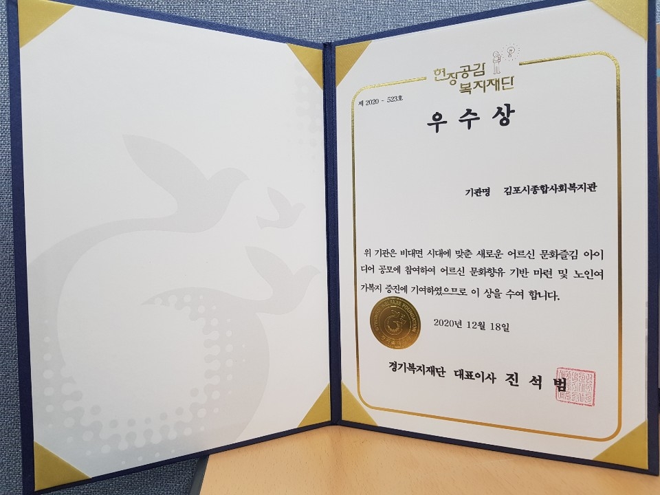 김포시종합사회복지관은 경기복지재단 \'2020 어르신 문화즐김 아이디어 공모\'에서 우수상을 수상하였습니다.