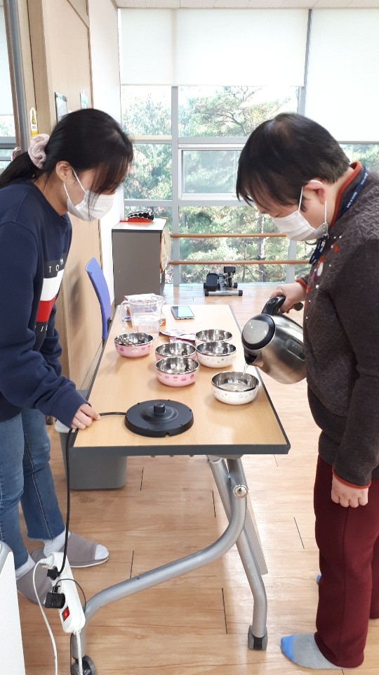 일상생활훈련으로 전기포트를 사용하여 따뜻한 차를 마시며 티타임시간을 보냈습니다.