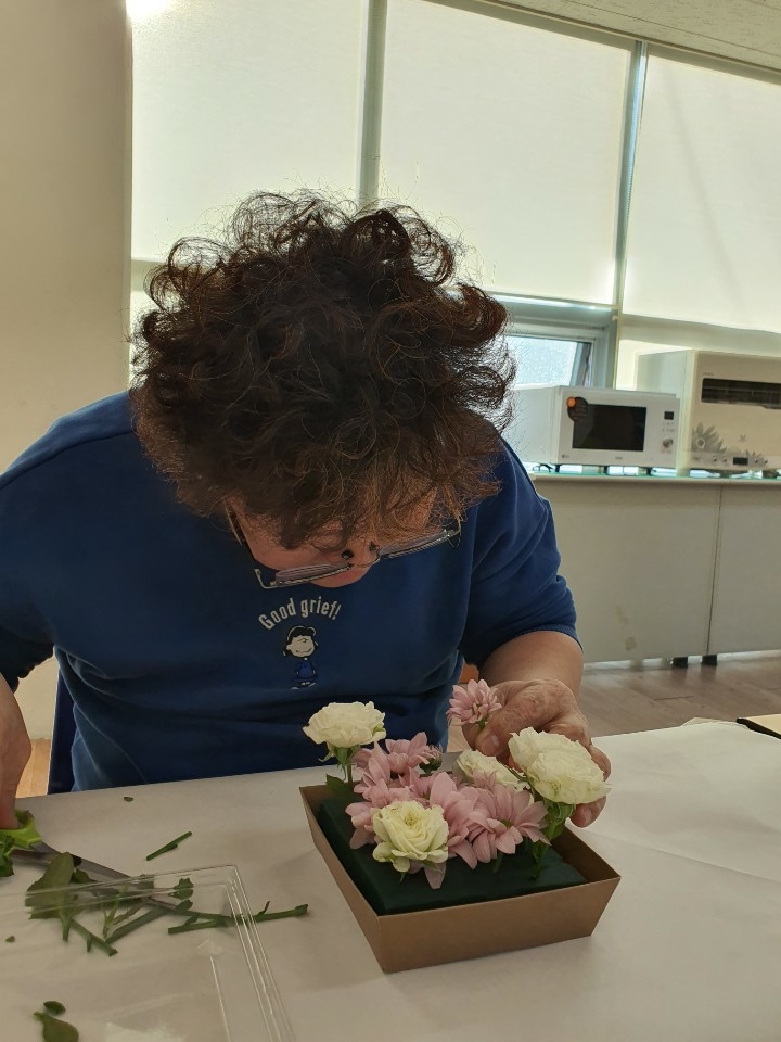 꽃향기 맡으며 꽃대를 자르고, 자른 꽃대를 폼에 직접 꽂아 디자인도 해보았습니다.