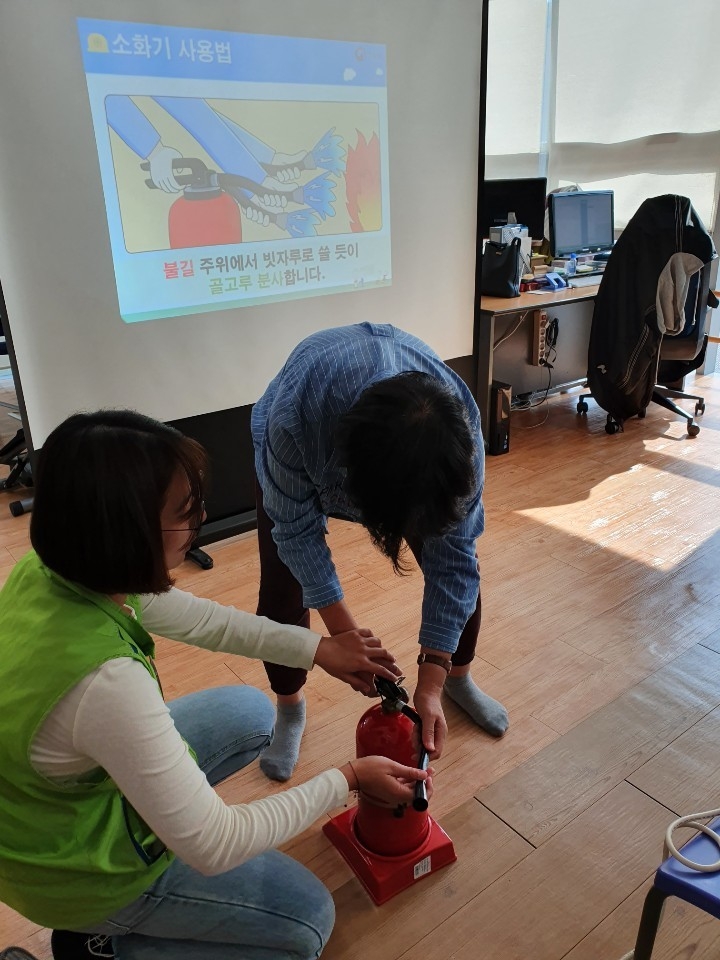 ■ 내 용 : 소화기 사용법 - PPT 사전교육과 실제 소화기를 보고 사용순서를 확인해보는 모의훈련 진행