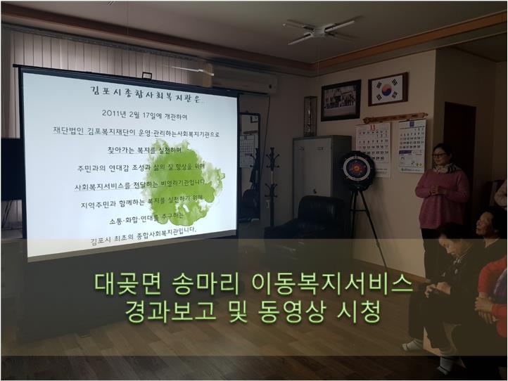 이번 간담회는 대곶면 송마2리 노인회관과, 통진읍 매수리마을10단지 작은도서관에서 각각 있었으며, 이동복지서비스에 대한 동영상 시청 및 경과보고, 향후 사업방향과 주민들의 의견을 듣는 시간으로 진행되었습니다.