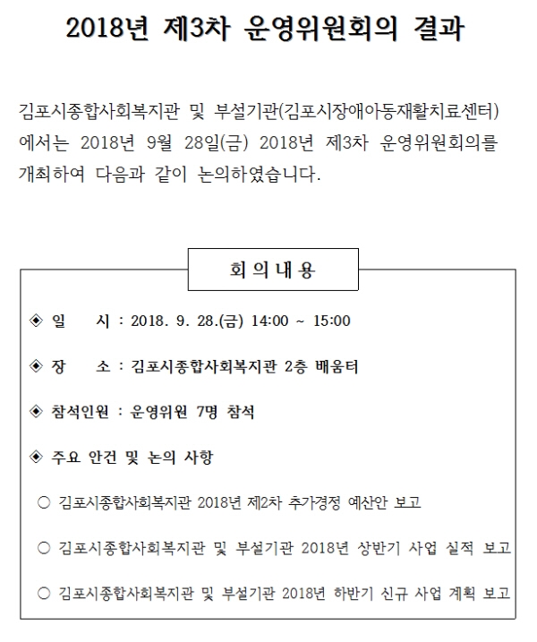 프린트 목록 2018년 제3차 운영위원회의 결과 공지 페이지 정보 관리자 조회 1,327 입력 2018-09-28 15:58 댓글 0 본문 사회복지시설 관리안내 지침에 의거하여 2018년 제3차 운영위원회의의 결과를 공지합니다. 첨부파일 제3차 운영위원회.jpg (227.7K) 15회 다운로드DATE : 2018-09-29 09:02:00 프린트 목록 이전글'우리동네 놀이터' 마을놀이당 2018.10.01 다음글멘토링 사업-'나는작가다' 문화체험 2018.09.28 댓글 0 댓글목록 등록된 댓글이 없습니다.