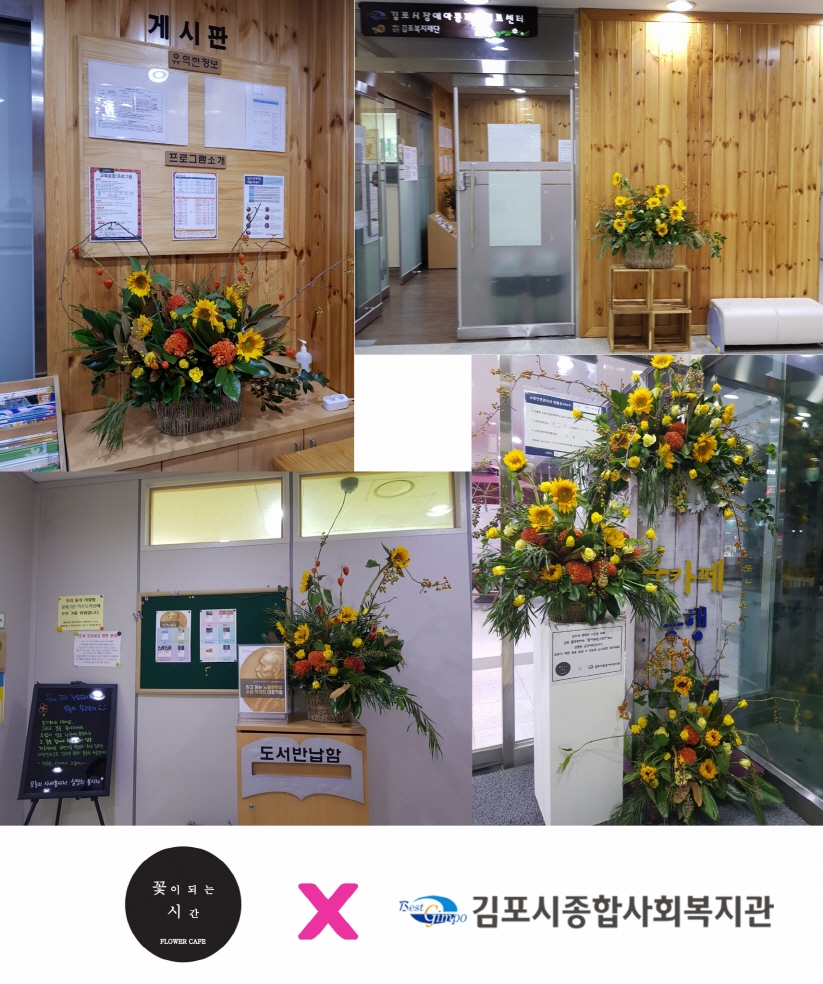 김포시 사우동에 소재한 플라워카페 \'(주)꽃이되는시간\'에서는 9월, 복지관과의 업무협약을 통해 분기별로 복지관 내부 공간아트 및 취약계층의 화훼교육을 지원하기로 하였습니다.
