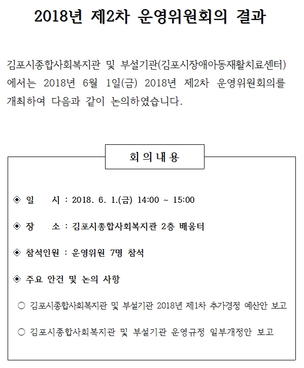 사회복지시설 관리안내 지침에 의거하여 2018년 제2차 운영위원회의의 결과를 공지합니다.