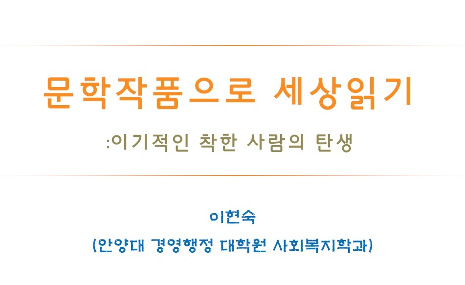 이번 강의는 문학작품으로 세상읽기 주제로 \"이기적인 착한 사람의 탄생\"이라는 책을 가지고