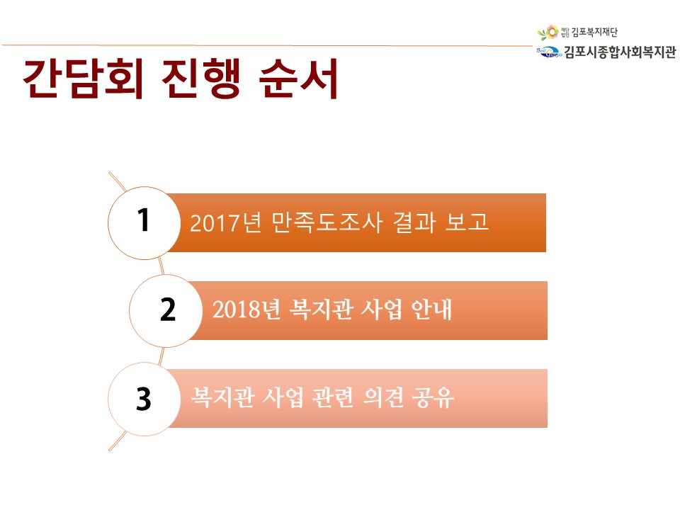 내 용 : 2017년 만족도 및 욕구조사 결과 분석 보고, 18년 사업 공유, 건의시항, 기타의견 공유