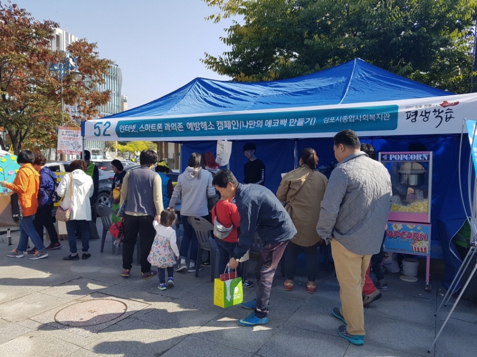 김포시종합사회복지관(관장 서상범)에서는 \'김포시평생학습박람회\'에 참여하여 \'인터넷 스마트폰 과의존 예방해소 캠페인\'을 실시하였습니다.