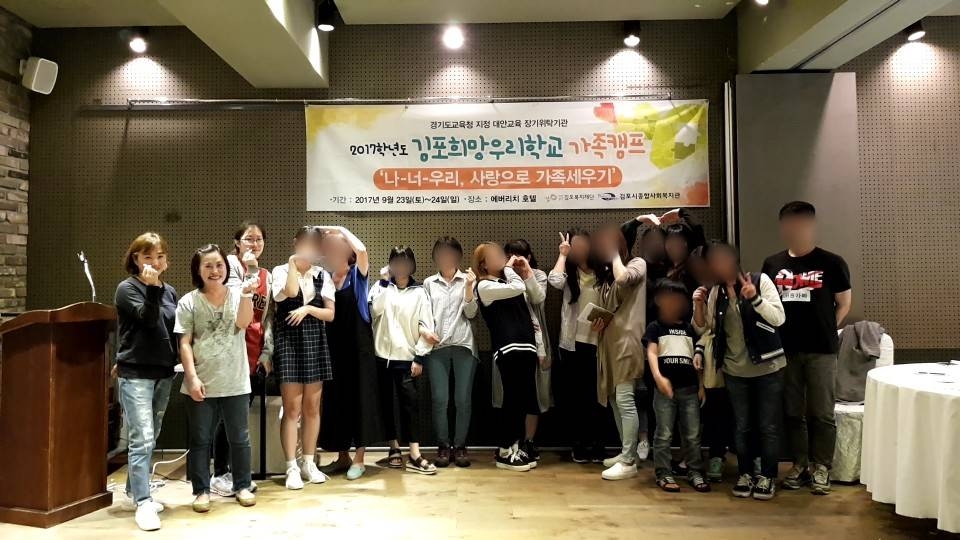 김포시종합사회복지관(관장 서상범)에서는 2017학년도 김포희망우리학교 가족캠프 ‘나-너-우리, 사랑으로 가족세우기’를 9월 23일(토)부터 24일(일)까지 1박2일 진행하였습니다. 김포희망우리학교는 김포시종합사회복지관이 경기도교육청으로 부터 지정받은 학력인정 대안교육 장기위탁기관으로 학교부적응 학생들을 대상으로 2017학년도 중학교 통합과정을 운영하고 있습니다.