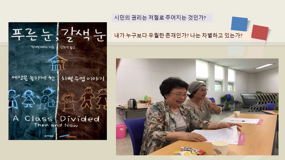 8월 30일(수) \"푸른 눈 갈색 눈\"이라는 도서를 가지고 차별, 사회구조, 경쟁, 신자유주의 등 서로의 생각을 나누는 시간을 가졌습니다.