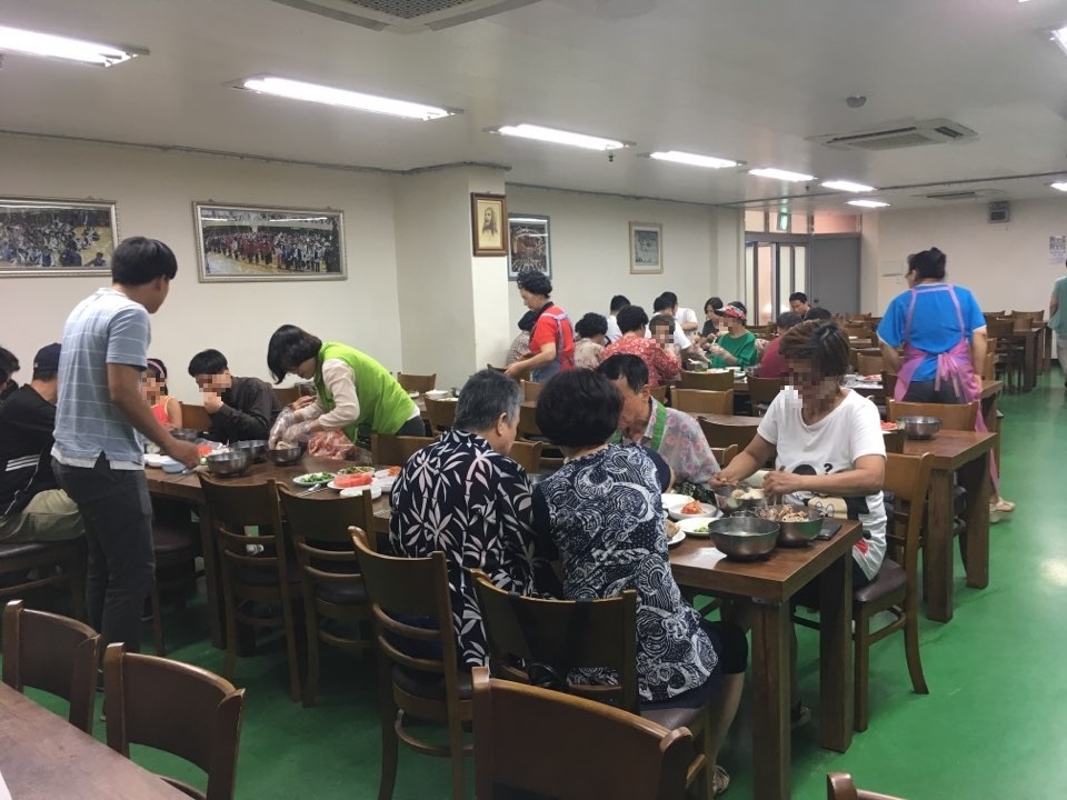 좋은 솜씨로 만드신 삼계탕과 함께 영양만점 찰밥, 맛있는 김치와 부추무침 등 푸짐한 반찬, 달고 맛있는 수박까지 후식으로 제공하여 영양보충이 필요한 분들을 모시고 풍성한 말복이 될 수 있었습니다.