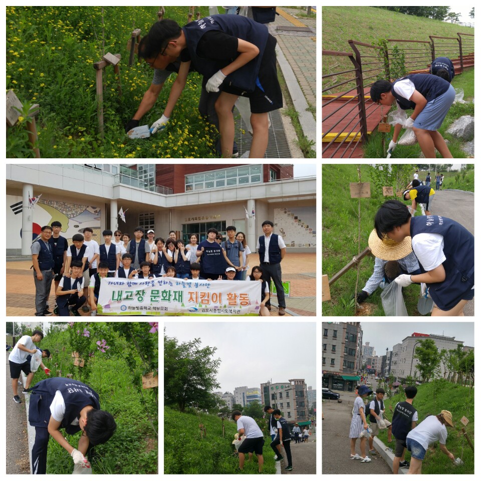 7월 22일(토)에는 김포시에 잘 알려지지 않았던 운양동 유적지(심응사당, 분구묘, 보호수 등)를 방문하여 김성수 역사강사님의 현장 해설과 함께 주변정화활동을 진행했습니다. 또한 이후 김포시독립운동기념관에서 문화해설사를 통해 역사강의를 듣고 곳곳에 심겨진 무궁화가 잘 자랄 수 있도록 비료 뿌리기 활동을 진행했습니다. 하늘빛탐험대 활동은 매월 1회 김포시 내의 문화재 및 관광명소를 방문하여 사진촬영을 하고 이와 함께 주변 환경정화활동 등을 함께 실시할 예정입니다.