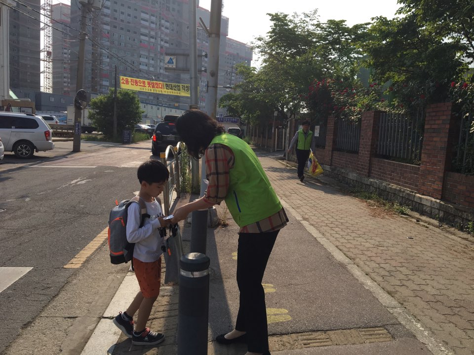 아침 일찍 나와서 아이들이 안전하게 등교할 수 있도록 사우초등학교 학부모들의 안전지도를 맞으며 아이들은 등교를 하며