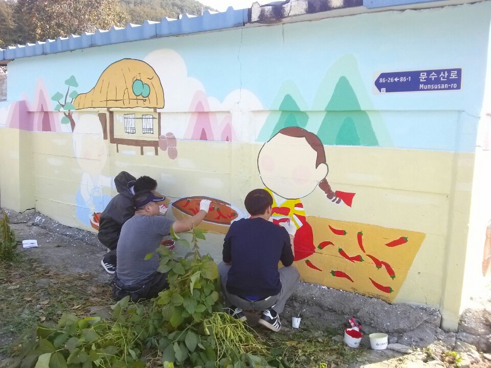 이날 벽화 그리기 사업은 복지관 직원과 마을주민, 이마트 김포한강점 직원봉사자가 참여해 성동1리의 벽과 주변담장에 벽화를 그려 마을 분위기를 바꾸었습니다. 전통 장을 생산하는 성동1리 마을의 이야기를 담아 노후 된 담장이 생동감 있는 벽화로 새롭게 단장했습니다.
