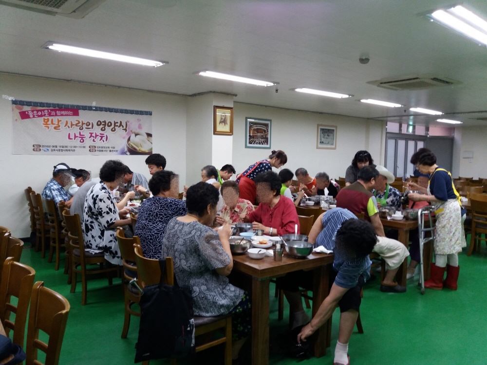 북변동에 위치한 김포중앙교회 내 여전도회가 주축이 되어 만들어진 마을봉사단 \'좋은이웃\'의 주관으로 말복을 맞이하여 \'복날 사랑의 영양식 나눔 잔치\'를 실시하였습니다.