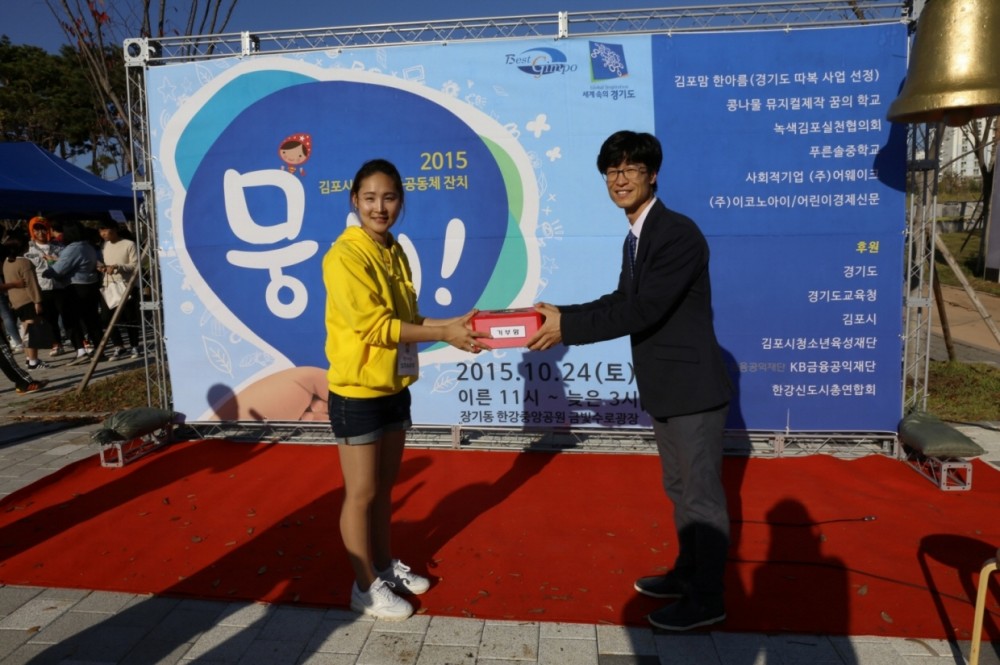 김포시종합사회복지관(관장 서상범) 무한돌봄네트워크팀에서 지난 10월 24일(토)에 김포한강신도시 김포맘 ‘한아름’에서 주최한 ‘뭉쳐!’ 축제에 다녀왔다. 축제 프로그램 중 ‘어린이경제벼룩시장’의 수익금 일부를 전달받아 지역 내 나눔을 실천하기 위함이다.