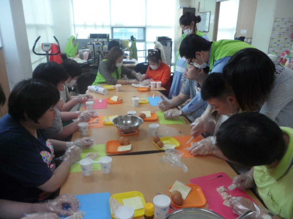(위생장갑 착용하기-계란빵에 들어갈 재료 썰기-종이컵에 준비한 재료 넣기-전자레인지 사용하여 굽기-시식)