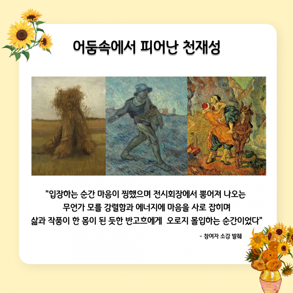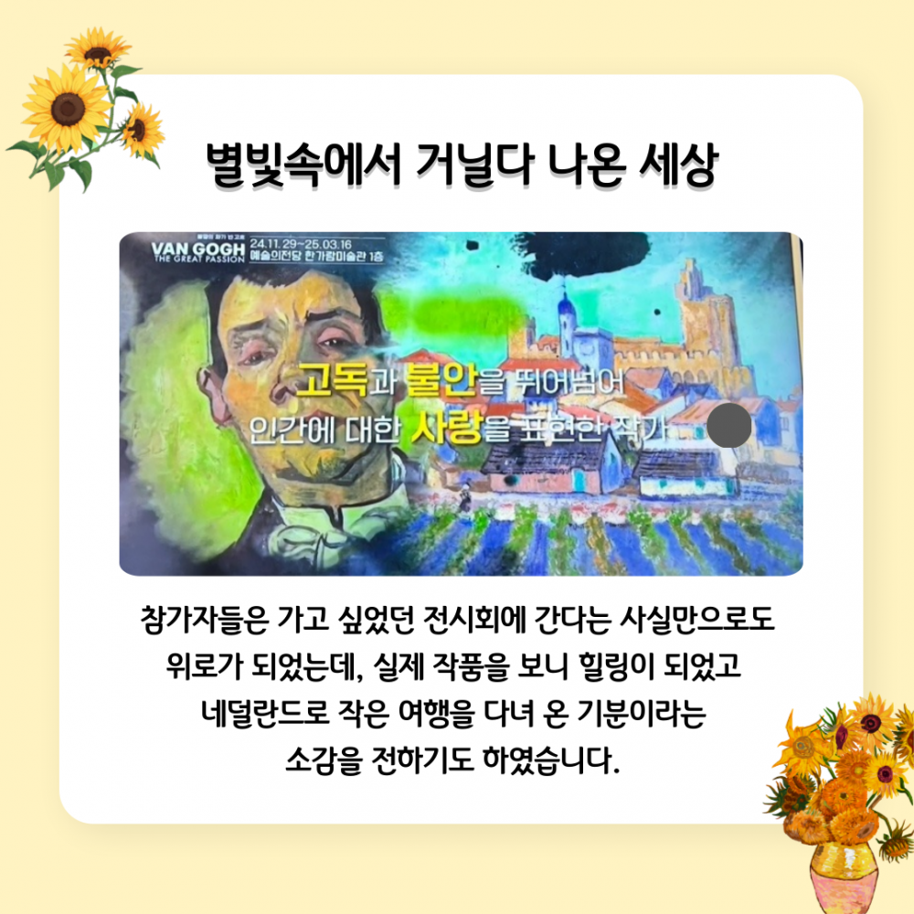 반 고흐의 작품 관람 후 모두 힐링이 되었으며 네덜란드로 여행을 다녀 온 기분이라는 소감들을 전해 주셨으며,