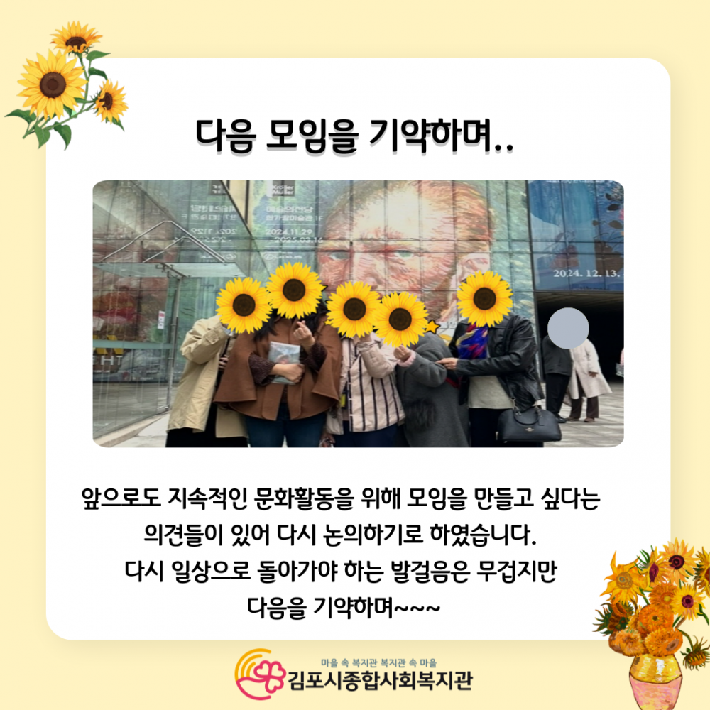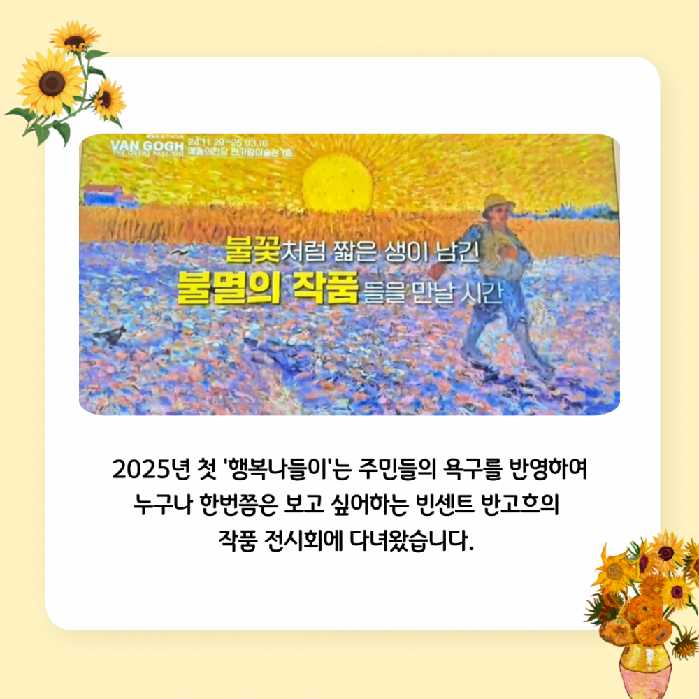 2025년 첫 '행복나들이'는 주민들의 욕구를 반영하여 누구나 한번쯤은 보고 싶어하는 빈센트 반고흐의 작품 전시회에 다녀왔습니다.