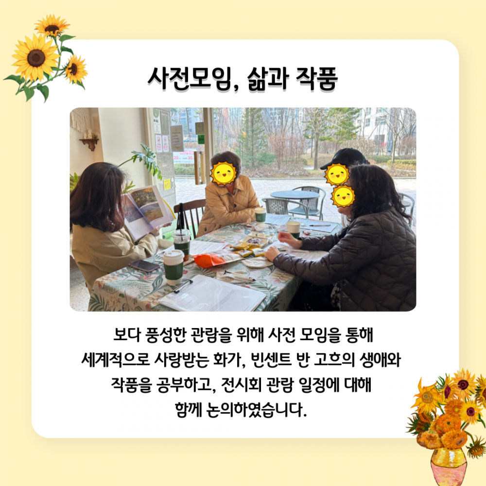 보다 풍성한 관람을 위해 사전모임을 통해 세계적으로 사랑받는 화가, 빈센트 반 고흐의 생애와 작품을 공부하고, 전시회 관람 일정에 대해 함께 논의하였습니다.