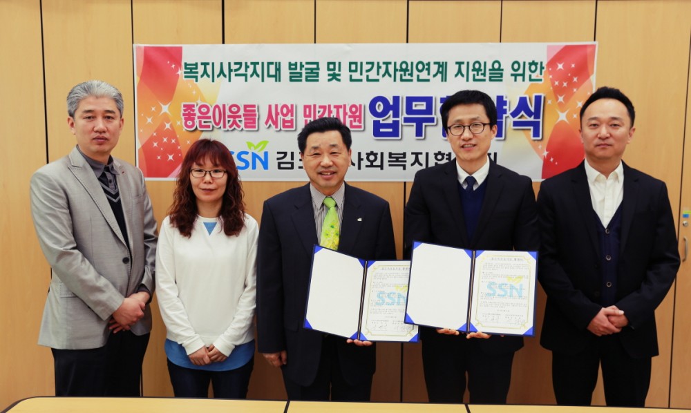 김포시종합사회복지관과 김포시사회복지협의회의 복지사각지대 발굴 및 민간자원연계 지원을 위한 좋은이웃들 사업 민간자원 업무협약식이 김포시종합사회복지관 4층 김포시사회복지협의회에서 진행되었다.
