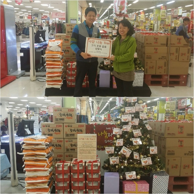 -12월 1일부터 홈플러스 김포풍무점 매장 방문 고객들이 트리에 걸린 아동카드를 보고 전달할 선물을 지정하여 기부하고, 풍무점에서도 식료품과 케이크를 지원하여 한부모가정과 소년소녀가장 20가정에 후원물품을 전달하였습니다.