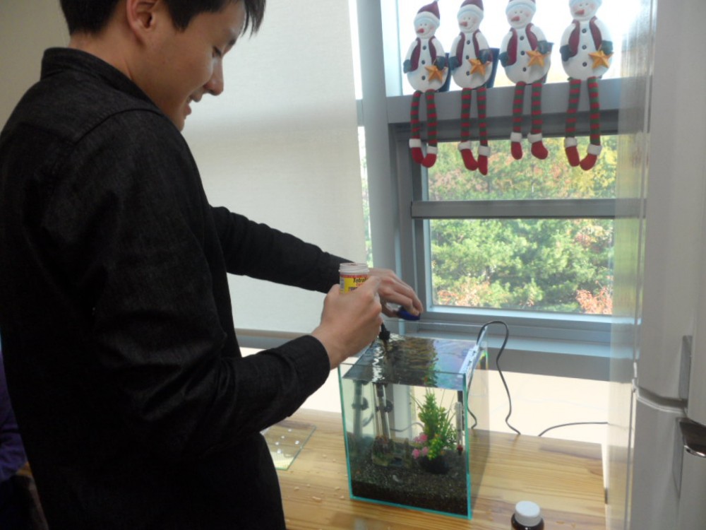어항 청소와 인공수초/수온계/히터기 설치 및 새로운 열대어를 키우기 위한 물맞댐과 먹이 주기를 지도했습니다.