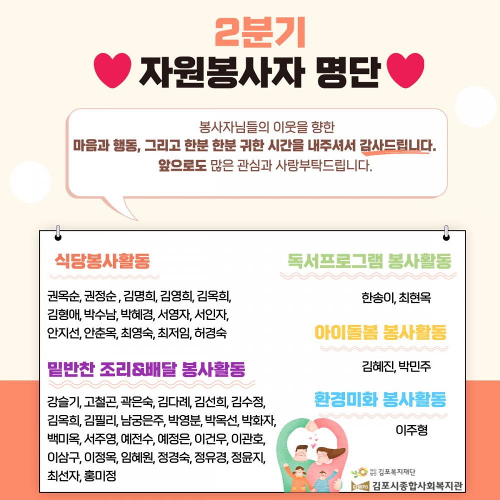 프린트 목록 2021년 2/4분기 자원봉사자 명단 페이지 정보 김포시종합사회복지관 조회 717 입력 2021-07-05 09:18 댓글 0 본문 2021년 2/4분기 자원봉사자 명단 첨부파일 2분기 자원봉사자명단.jpg (286.0K) 43회 다운로드DATE : 2021-07-05 09:18:23 프린트 목록 이전글2021년 2/4분기 우수자원봉사자를 소개합니다. 2021.08.02 다음글2020년 4/4분기 자원봉사자 명단 2020.12.29 댓글 0 댓글목록 등록된 댓글이 없습니다.