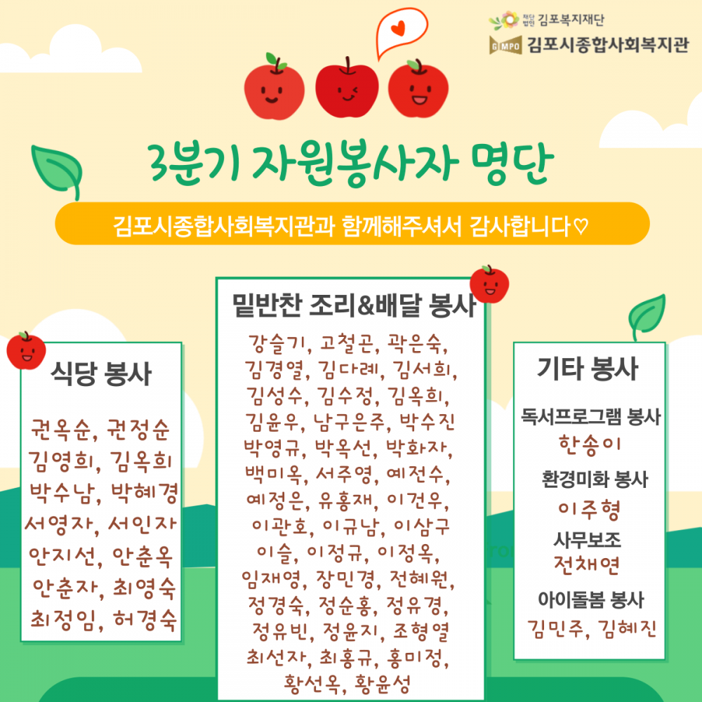 프린트 목록 2021년 3/4분기 자원봉사자 명단 페이지 정보 김포시종합사회복지관 조회 823 입력 2021-10-19 08:42 댓글 0 본문 2021년 3/4분기 자원봉사자 명단 첨부파일 3분기 봉사자 명단.png (328.2K) 30회 다운로드DATE : 2021-10-19 08:42:49 프린트 목록 이전글2021년 3분기 우수봉사자 선정 2021.11.16 다음글2021년 2/4분기 우수자원봉사자를 소개합니다. 2021.08.02 댓글 0 댓글목록 등록된 댓글이 없습니다.