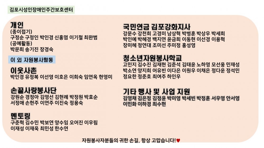 프린트 목록 2019년 1/4분기 자원봉사자 명단 페이지 정보 김포시종합사회복지관 조회 765 입력 2019-07-02 19:37 댓글 0 본문 첨부파일 슬라이드1.JPG (226.3K) 41회 다운로드DATE : 2019-07-02 19:37:56 슬라이드2.JPG (180.4K) 42회 다운로드DATE : 2019-07-02 19:37:56 프린트 목록 이전글2019년 1/4분기 우수자원봉사자 2019.07.02 다음글2018년 4/4분기 자원봉사자 명단 2019.01.07 댓글 0 댓글목록 등록된 댓글이 없습니다.