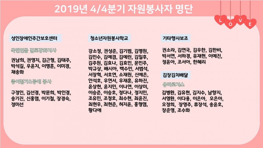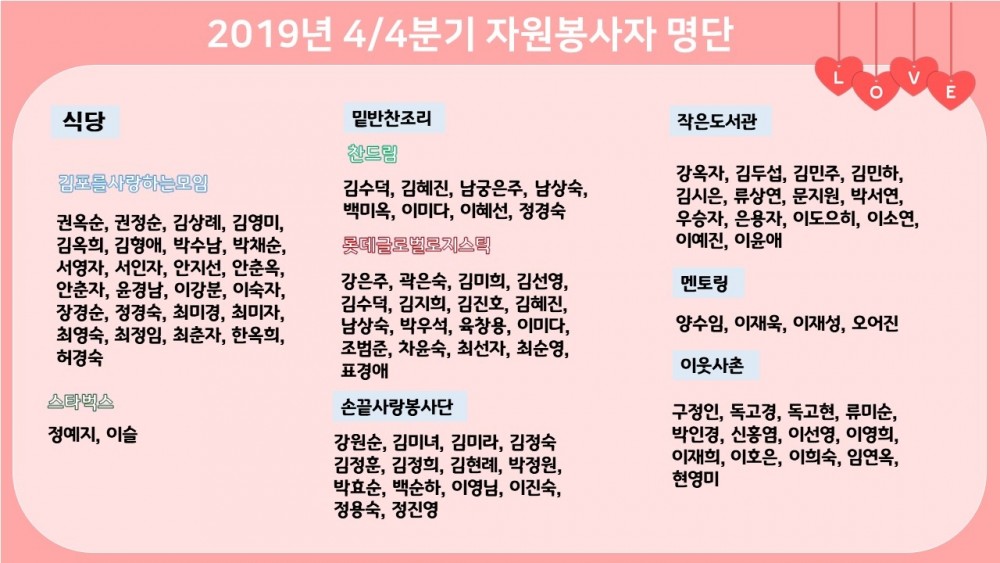 프린트 목록 2019년 4/4분기 자원봉사자 명단 페이지 정보 관리자 조회 917 입력 2020-01-07 13:51 댓글 0 본문 첨부파일 홈피_1.jpg (183.9K) 42회 다운로드DATE : 2020-01-07 13:51:22 홈피_2.jpg (165.1K) 42회 다운로드DATE : 2020-01-07 13:51:22 프린트 목록 이전글2020년 1/4분기 자원봉사자 명단 2020.03.30 다음글2019년 3/4분기 자원봉사자 명단 2019.10.18 댓글 0 댓글목록 등록된 댓글이 없습니다.