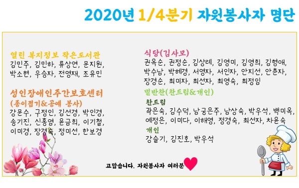 프린트 목록 2020년 1/4분기 자원봉사자 명단 페이지 정보 관리자 조회 859 입력 2020-03-30 09:43 댓글 0 본문 첨부파일 1분기(홈피) .jpg (68.0K) 42회 다운로드DATE : 2020-03-30 09:43:45 프린트 목록 이전글2020년 1/4분기 우수자원봉사자 2020.04.17 다음글2019년 4/4분기 자원봉사자 명단 2020.01.07 댓글 0 댓글목록 등록된 댓글이 없습니다.