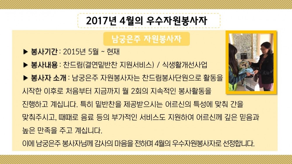 프린트 목록 2017년 4월의 우수자원봉사자 페이지 정보 관리자 조회 1,010 입력 2017-05-12 13:44 댓글 0 본문 첨부파일 4월우수자원봉사자.jpg (237.5K) 40회 다운로드DATE : 2017-05-12 13:50:04 프린트 목록 이전글2017년 2분기 자원봉사자 명단 2017.07.06 다음글2017년 1/4분기 개인 및 단체 자원봉사자 명단 2017.04.03 댓글 0 댓글목록 등록된 댓글이 없습니다.