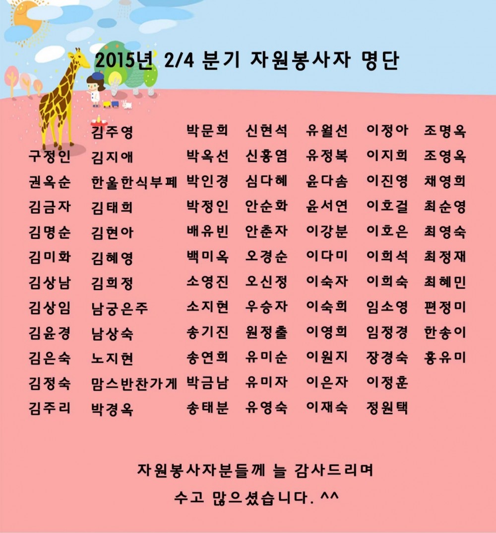프린트 목록 2015년 2/4분기 자원봉사자 명단 페이지 정보 관리자 조회 1,064 입력 2015-07-13 14:39 댓글 0 본문 첨부파일 2분기자봉명단.jpg (262.4K) 38회 다운로드DATE : 2015-07-13 14:39:36 프린트 목록 이전글2015년 8월 우수자원봉사자 2015.08.14 다음글2015년 6월 우수자원봉사자 2015.07.13 댓글 0 댓글목록 등록된 댓글이 없습니다.