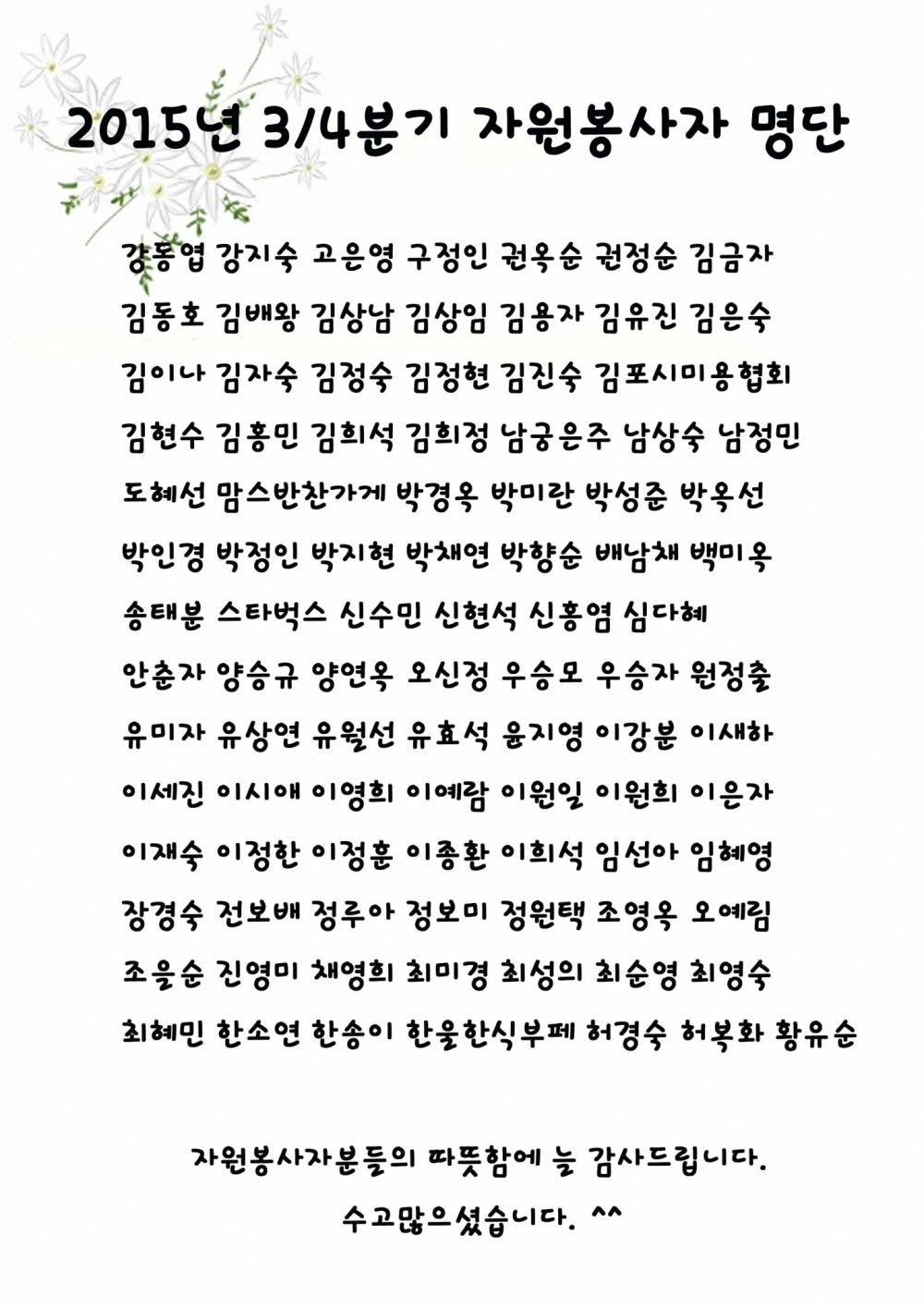 프린트 목록 2015년 3/4분기 자원봉사자 명단 페이지 정보 관리자 조회 1,070 입력 2015-10-05 16:10 댓글 0 본문 첨부파일 3분기자봉명단.jpg (574.3K) 38회 다운로드DATE : 2015-10-27 16:10:34 프린트 목록 이전글2015년 10월의 우수자원봉사자 선정 2015.10.27 다음글2015년 8월 우수자원봉사자 2015.08.14 댓글 0 댓글목록 등록된 댓글이 없습니다.