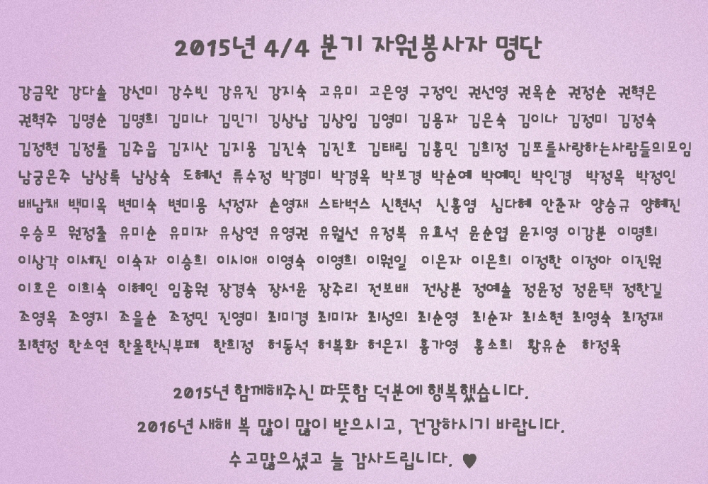 프린트 목록 2015년 4/4분기 자원봉사자 명단 페이지 정보 관리자 조회 1,165 입력 2016-01-04 13:55 댓글 0 본문 첨부파일 4분기자봉명단.jpg (1.1M) 40회 다운로드DATE : 2016-01-06 13:55:17 프린트 목록 이전글2016년 2월의 우수자원봉사자 2016.02.29 다음글2015년 12월 우수자원봉사자 및 단체 2015.12.30 댓글 0 댓글목록 등록된 댓글이 없습니다.