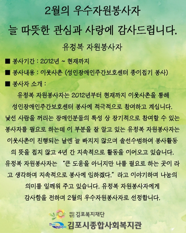 프린트 목록 2016년 2월의 우수자원봉사자 페이지 정보 관리자 조회 1,024 입력 2016-02-29 13:45 댓글 0 본문 첨부파일 게시복사.jpg (971.1K) 41회 다운로드DATE : 2016-02-29 13:46:43 프린트 목록 이전글2016년 1/4분기 자원봉사자 명단 2016.04.15 다음글2015년 4/4분기 자원봉사자 명단 2016.01.04 댓글 0 댓글목록 등록된 댓글이 없습니다.