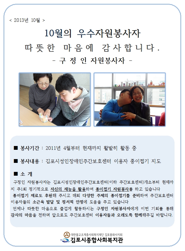 프린트 목록 10월 우수자원봉사자 페이지 정보 김포시종합사회복지관 조회 1,166 입력 2013-10-29 11:09 댓글 0 본문 10월의 우수자원봉사자 따뜻한 마음에 감사합니다 첨부파일 20131029_105950.jpg (314.8K) 36회 다운로드DATE : 2013-10-29 11:09:20 프린트 목록 이전글10월 봉사자 명단 2013.11.08 다음글2013년 상반기 자원봉사 활동 명단 2013.09.02 댓글 0 댓글목록 등록된 댓글이 없습니다.
